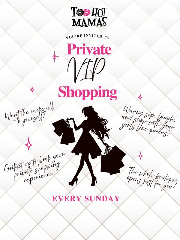 Too Hot Mamas offers private shopping every Sunday. Whether it's a girls' trip, bachelorette party, mother-daughter day, or a sip and shop event, we've got you covered. Reserve an appointment on Sundays to have the entire store exclusively for you. Our staff will attend to all your needs, ensuring you have the shopping experience you've always dreamed of. Make your reservation below.